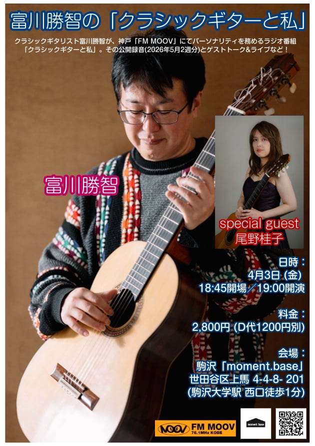 クラシックギタリストの富川勝智がパーソナリティを務める新ラジオ番組「クラシックギターと私」 (神戸コミュニティFM「FM MOOV」)。その公開録音(2026年5月2週分)イベントを開催いたします。今回のゲストは!<尾野桂子>さんです。皆様のご来場御待ちしています。