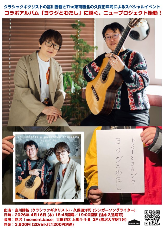 クラシックギタリストの富川勝智と、The東南西北の久保田洋司によるスペシャルトークイベント。アルバム「ヨウジとわたし」に続き、2026年!新たな展開が!お気軽にご参加ください。